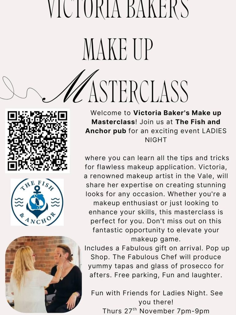 Second venue secured. The Fish and Anchor Inn, Offenham We now have LADIES NIGHT! Thurs 27th November 7-9pm Make up Masterclass, Tapas and fizz. pop up shop and beautiful gift for you. Get your girlfriends together for a fun evening. To Book use the QR code on the poster or link below